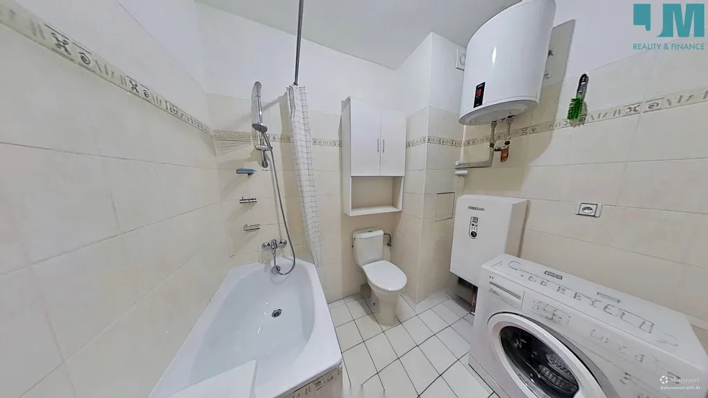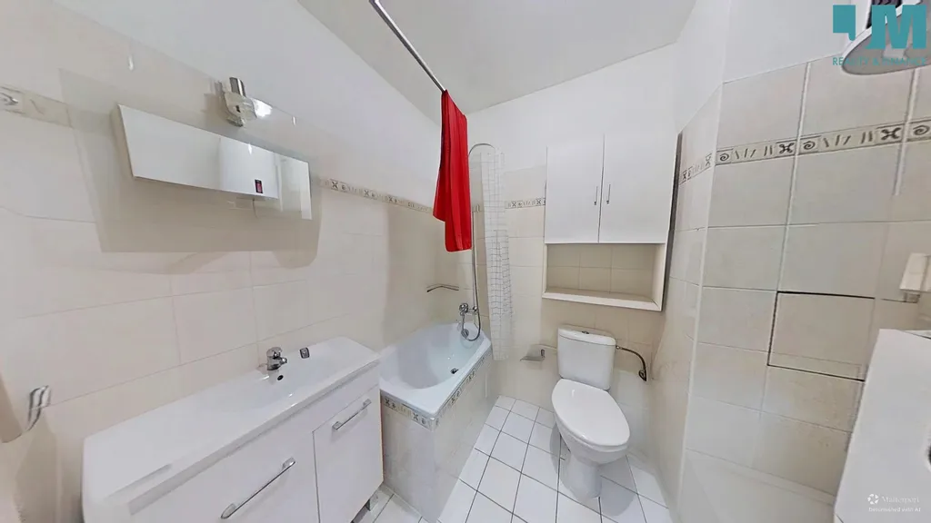 Koupelna je udržovaná a prakticky řešená: vana se sprchovou baterií, umyvadlo se skříňkou, zrcadlo, toaleta, plynový kotel a bojler na ohřev vody. Díky světlým obkladům působí koupelna čistě a vzdušně.