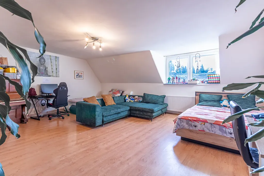 K bytu náleží půdní prostor nad bytem. Vchod na půdu, schodiště a přístup ke střešnímu výlezu je společná část domu. Je možné rozšíření bytu do půdy (mezonet). Jen pokud by se zasahovalo do střechy atd., je nutný souhlas Společenství vlastníků.
