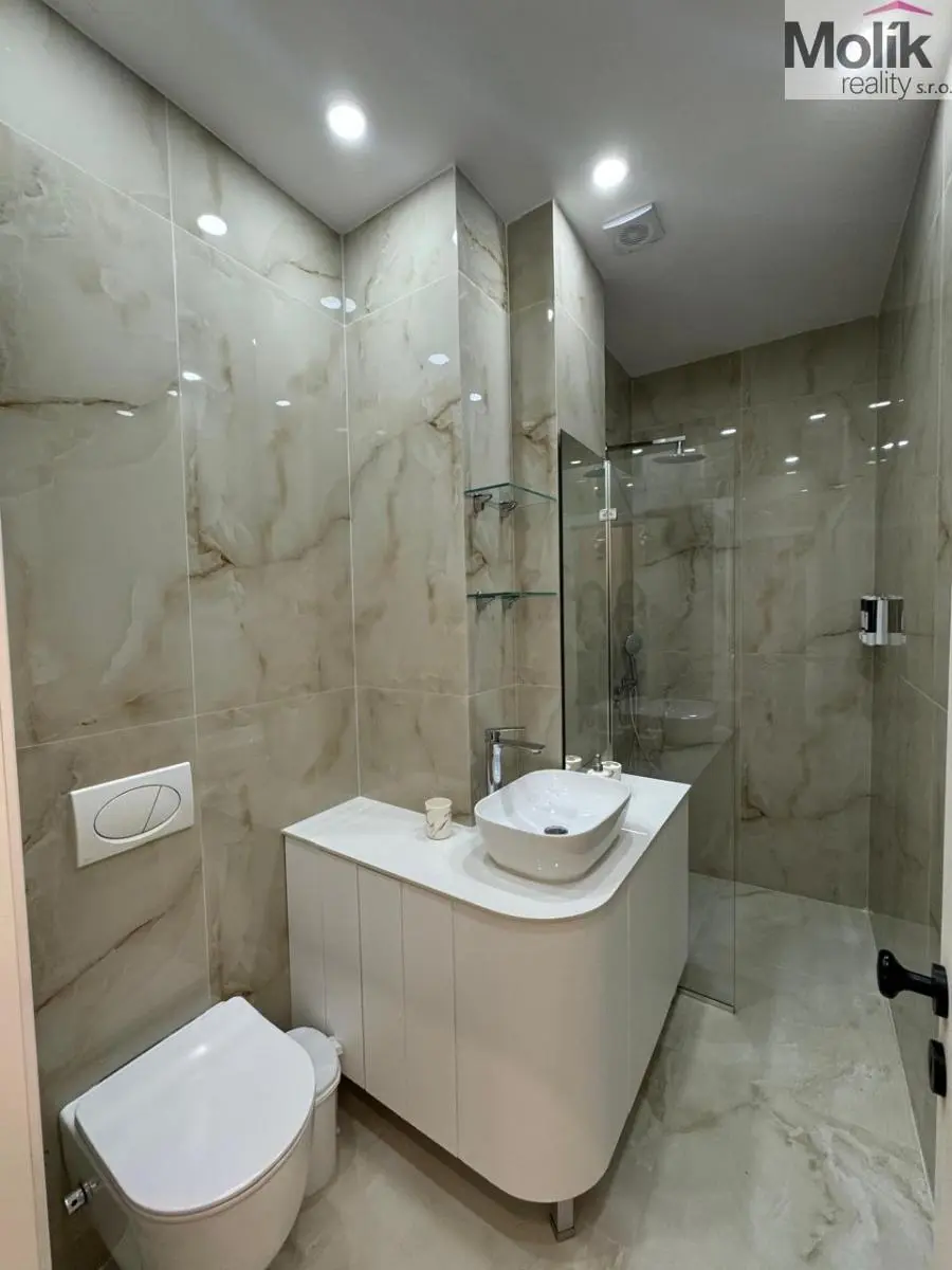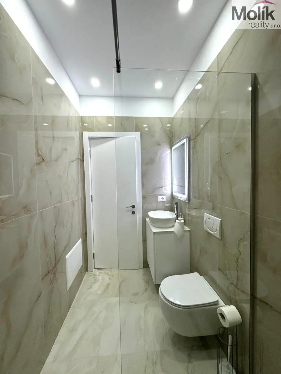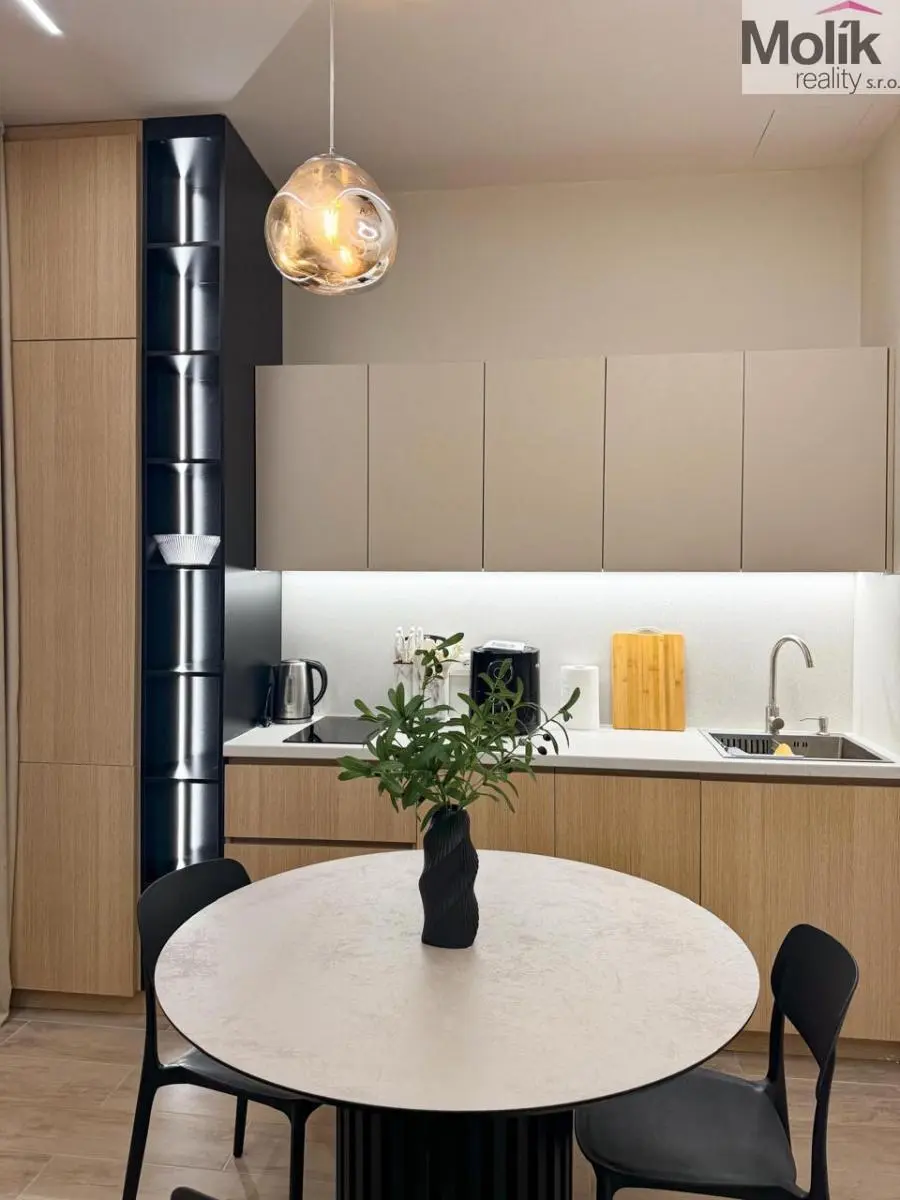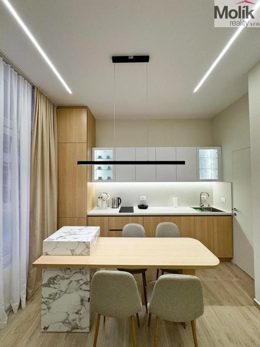 Vybavení: Designová TV stěna s mramorovým dekorem, stylový jídelní kout, ložnice s prémiovou šatní stěnou a integrovaným LED podsvícením.