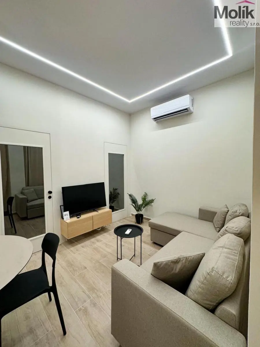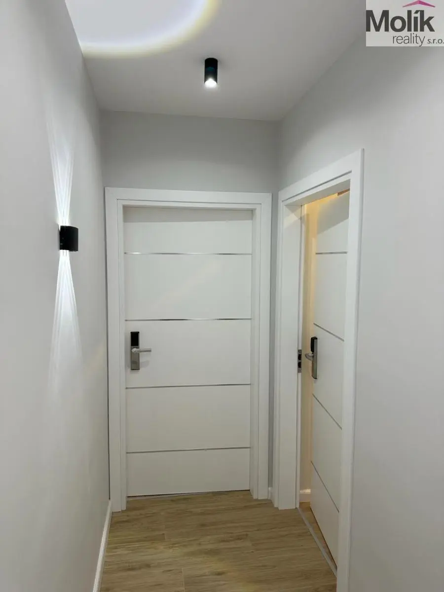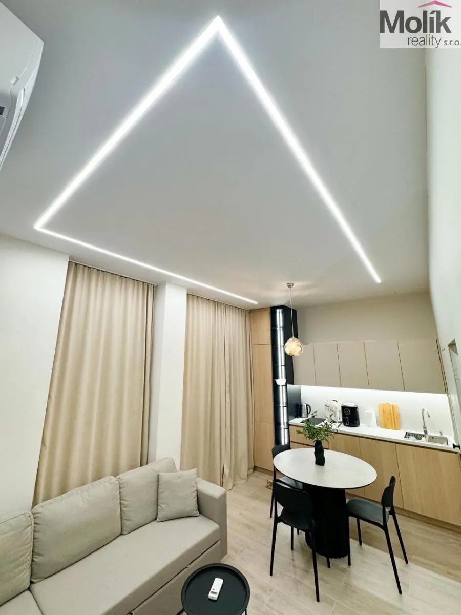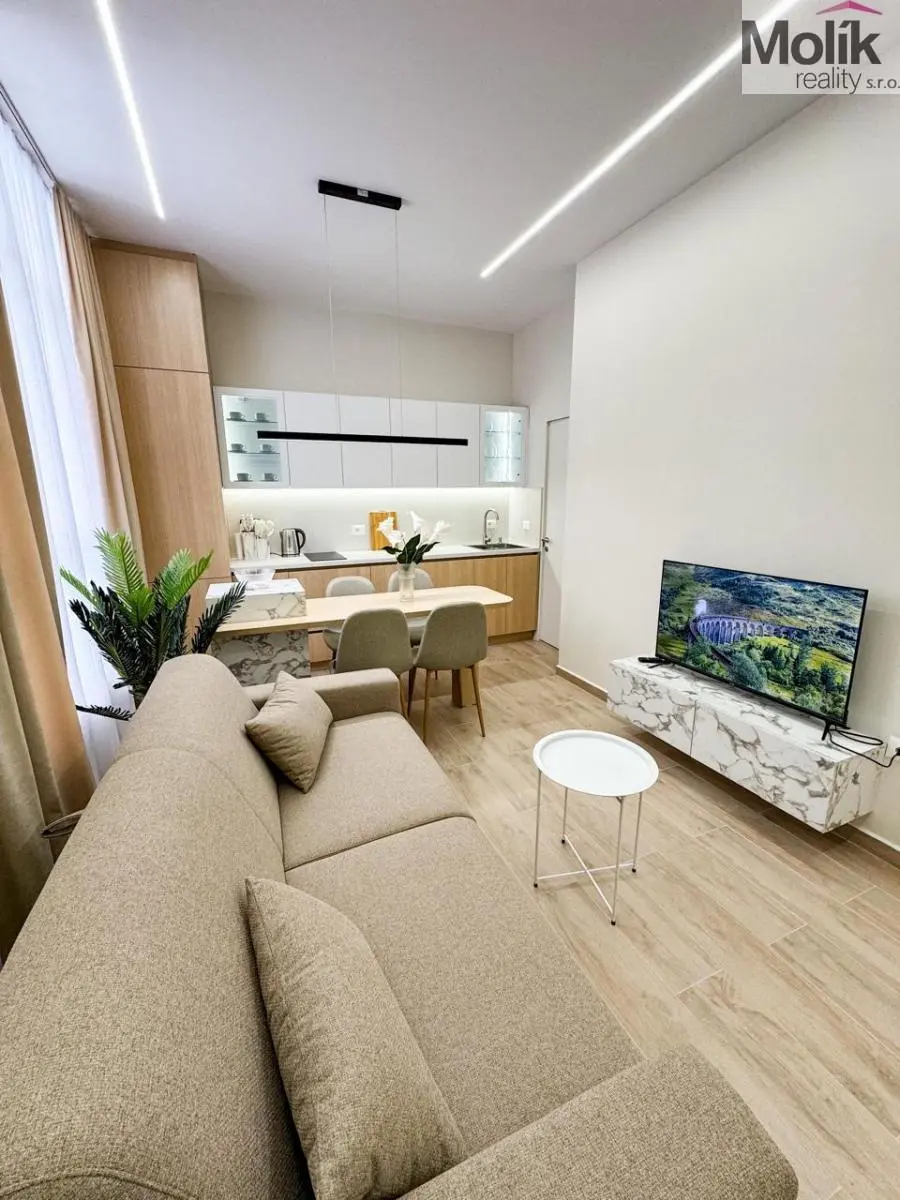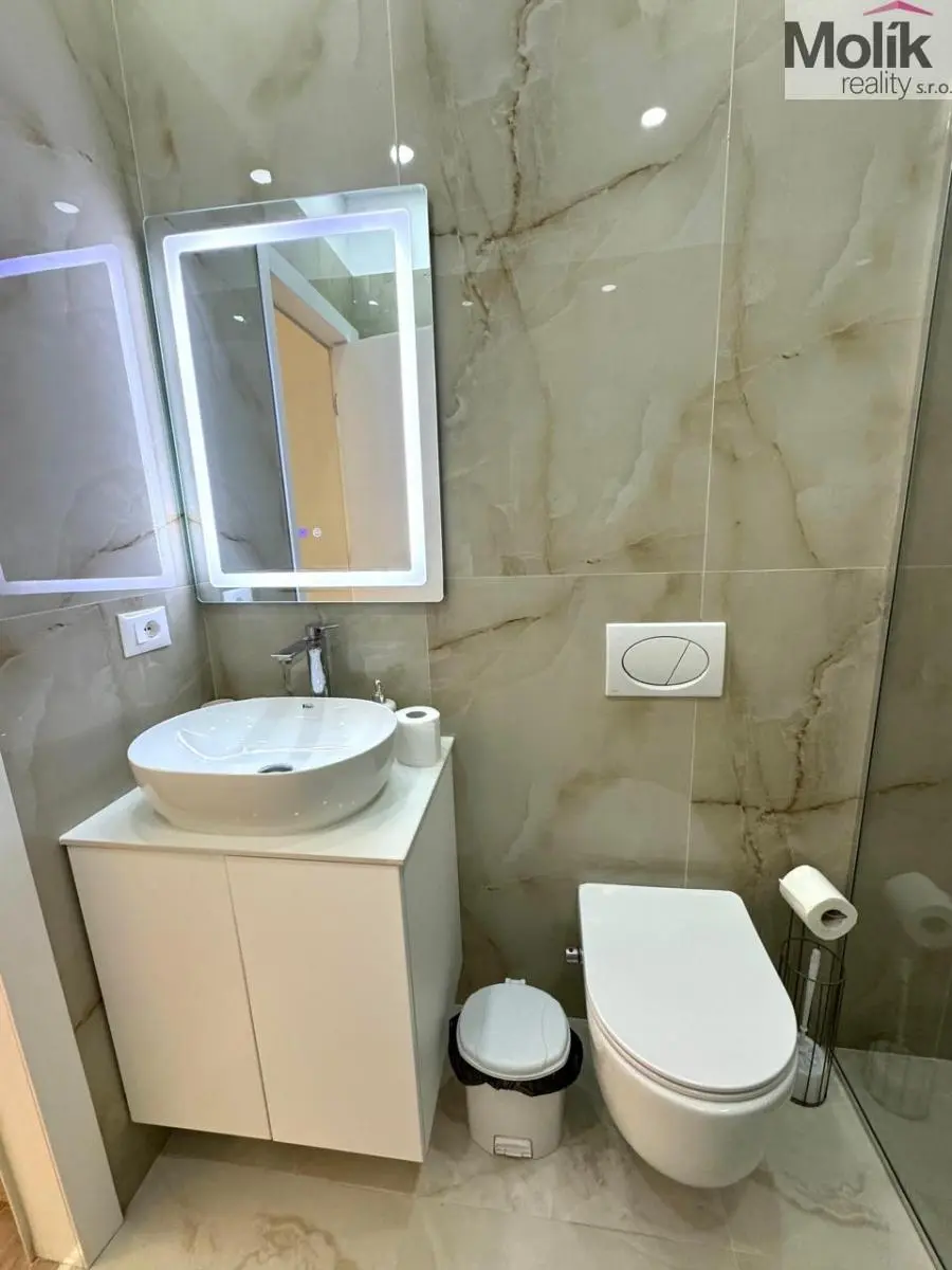 Vybavení: Designová TV stěna s mramorovým dekorem, stylový jídelní kout, ložnice s prémiovou šatní stěnou a integrovaným LED podsvícením.