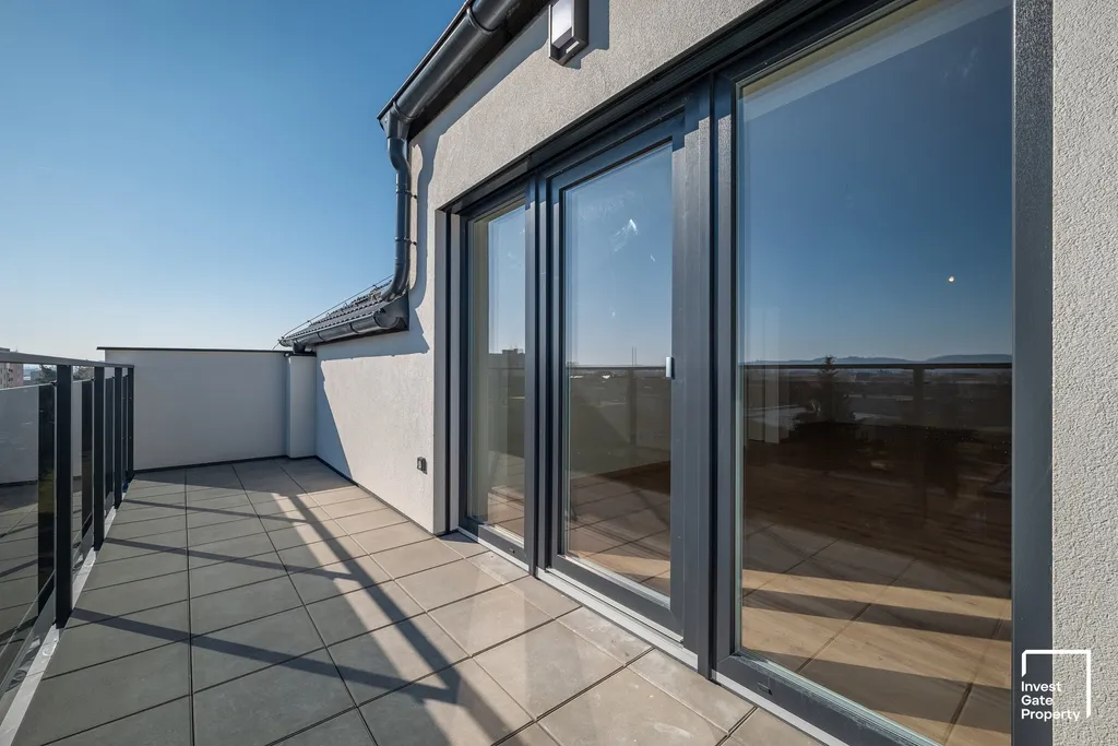 Dispozice bytu je 2+kk a jeho celková užitná plocha činí 100m2 (podlahová plocha bytu činí 70m2, terasa má výměru 12,5m2, kryté parkovací stání 15m2 a sklep 3m2). Byt se nachází ve 5. nadzemním podlaží domu – jedná se o podkrovní byt. Ložnice se střešními okny má skutečně nezaměnitelnou atmosféru a na terase je nad vámi jen obloha. Byt je orientovaný na východní stranu.