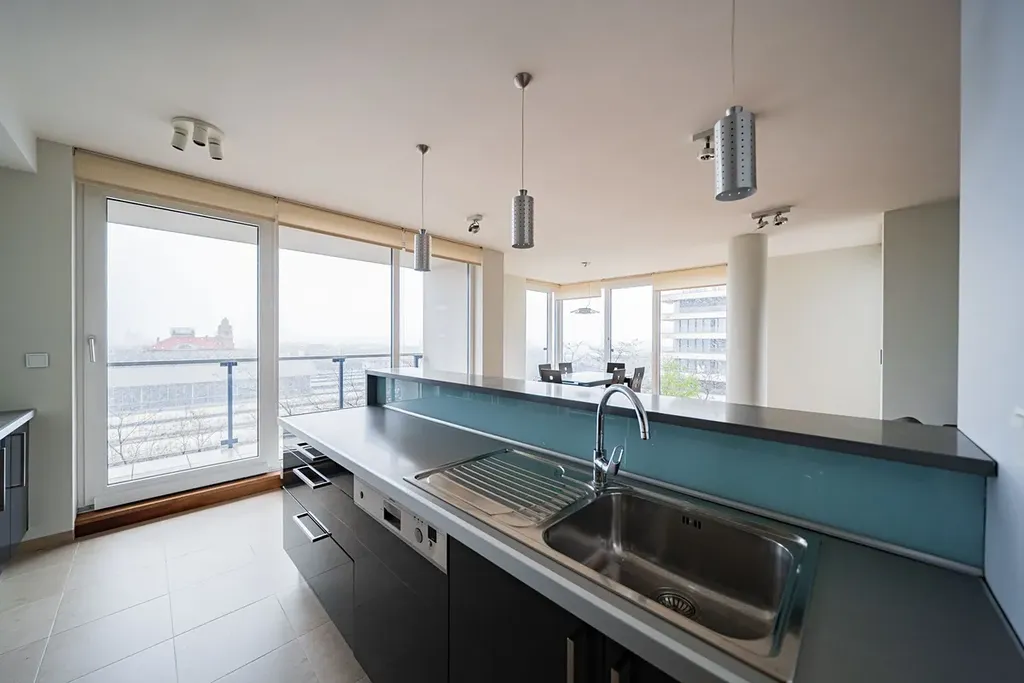 Interiér bytu je zařízený a dispozičně nabízí prostorný a světlý obývací pokoj spojený s moderní kuchyní a jídelním prostorem. Dále byt disponuje 3 ložnicemi, každá s vestavěnými skříněmi, dvěma koupelnami; jedná je vybavena vanou a sprchovým koutem, a druhá koupelna je vybavena sprchovým koutem. Součástí vybavení jsou: pračka a samostatná sušička, kabelové, SAT, telefonní a internetové připojení jsou též k dispozici. Byt je plně klimatizovaný, zařízen luxusním nábytkem, včetně na zakázku vyrobených postelí a skříní, na podlahách jsou parkety a dlažba. K bytu náleží sklep (4 m2) a k dispozici je i parkovací stání v podzemní garáži (za extra poplatek 5.000 Kč za místo).