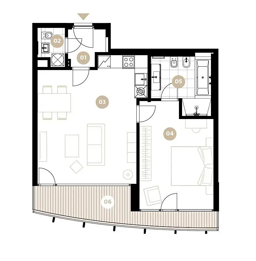 Luxusní, zařízený designový byt 2+kk (1 ložnice, 1 koupelna), s terasou (9,48m2) a celkovou obytnou plochou 71,48m2, je situován ve 4. patře zcela nového luxusního rezidenčního komplexu s výtahem, recepcí, bazénem, saunou, prostornou zahradou ve dvoře, sklepem a možností parkování v podzemním parkovišti.