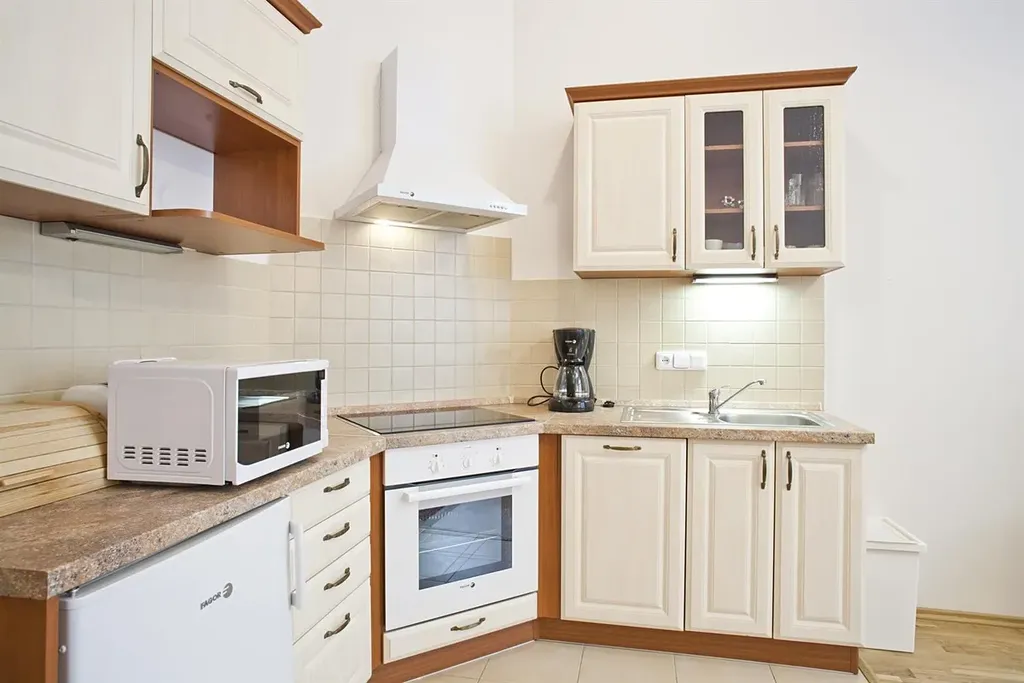 Kompletně zařízený byt 2+kk, o celkové obytné ploše 40m2, je situovaný v přízemí dobře udržovaného historického domu s výtahem v oblíbené rezidenční lokalitě Vinohrady na Praze 2, ulice Na Kozačce.