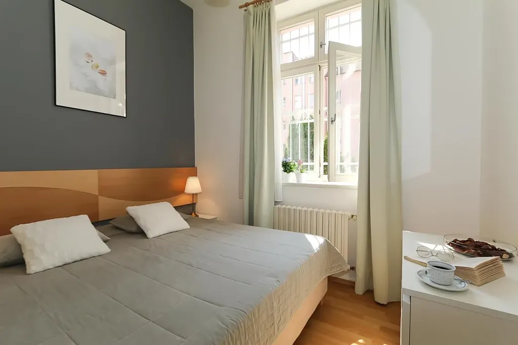 Moderní zařízený, prostorný byt 2+kk o celkové rozloze 42 m2 se nachází v 1.patře historického rezidenčního domu s výtahem na Praze 2 Vinohrady, ulice Belgická. V bytě se nachází obývací pokoj se vstupem na balkon, jídelním prostorem a kuchyňským koutem, který je vybavený veškerými vestavěnými spotřebiči (sporák, trouba, lednice, myčka, mikrovlnní trouba), ložnice s manželskou postelí a vlastní koupelnou s vanou. Na podlahách parkety a dlažba. Další vybavení bytu: pračka se sušičkou, LCD TV, DVD, SAT , WiFi.