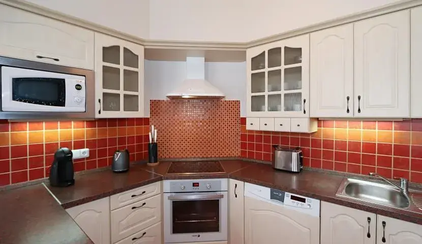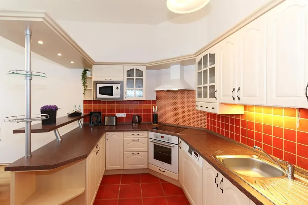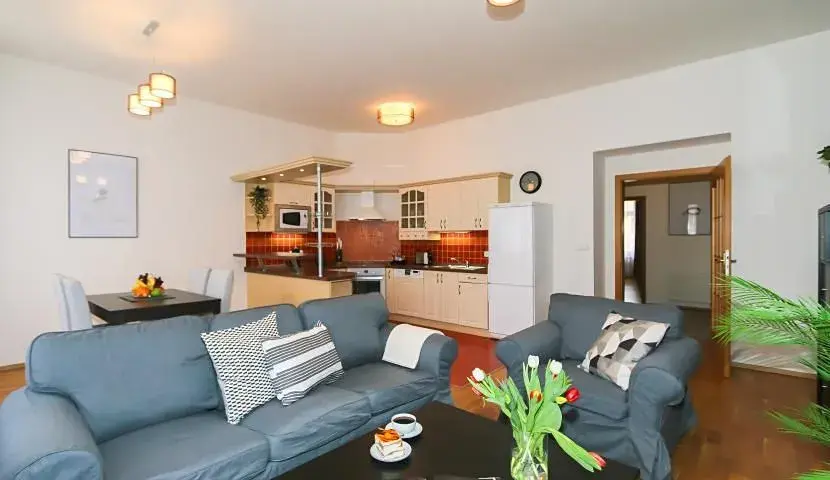 Byt sestává ze vstupní chodby, obývacího pokoje, propojeného s kuchyňským koutem vybaveným spotřebiči (lednice, troubou se sporákem, mikrovlnkou, konvice, kávovar a toustovač), 2 ložnic a koupelnou s vanou a pračkou se sušičkou. Toaleta je odděleně. Na podlahách jsou parkety a dlažba. Další vybavení: TV se satelitem, DVD, WiFi, vysavač, žehlička + žehlící prkno.