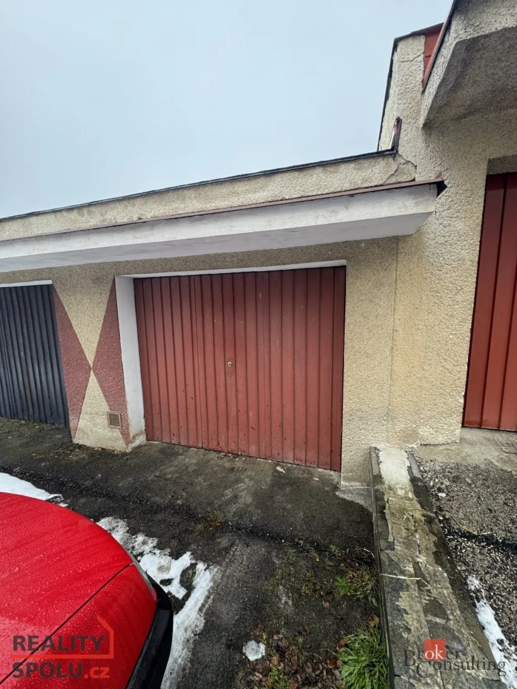 Garáž v dobrém stavu s novou střechou. Vjezd zajišťují vyklápěcí plechová vrata. Dostatek úložného prostoru.