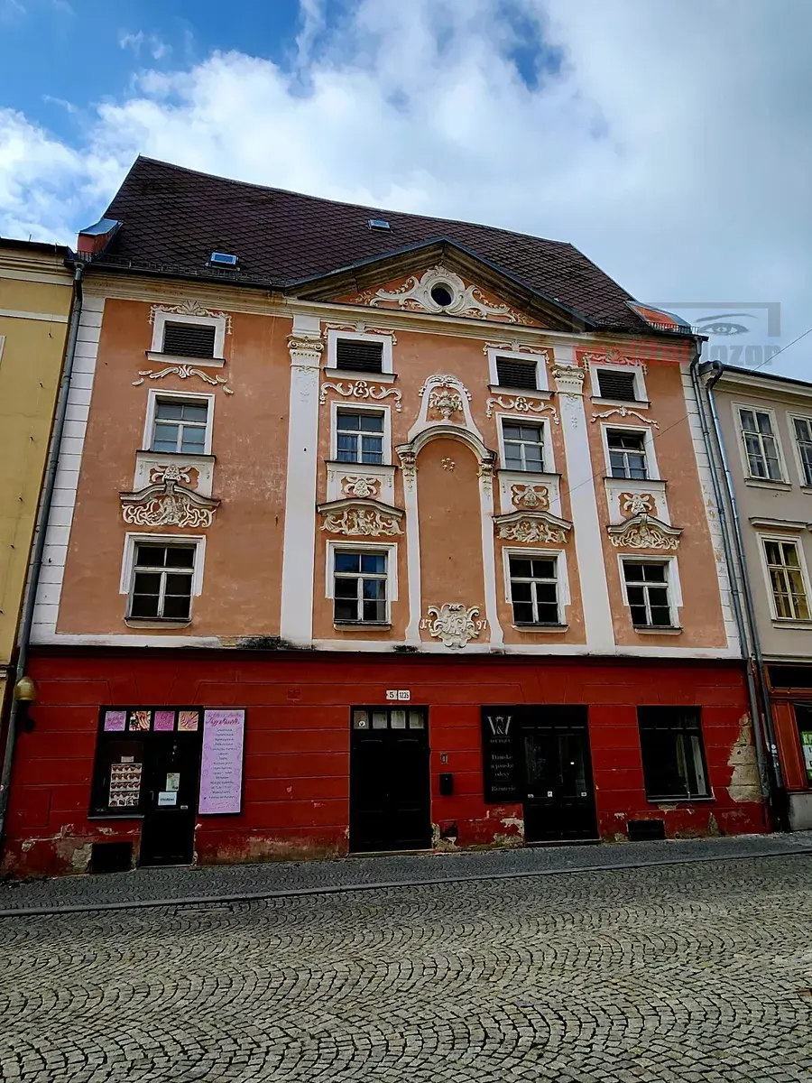 2NP - volný prostor na obchodní činnost/kancelář nebo k bydlení. Nádherné upravené prostory s trámovým stropem, renesančním klenutím a malbou. Výměra celkem 89 m2 = chodba 11 m2 a dvě samostatné místnosti 33 a 36 m2, orientované do ulice i dvora domu. Zázemí tvoří kuchyňka 7 m2 a WC - volné
