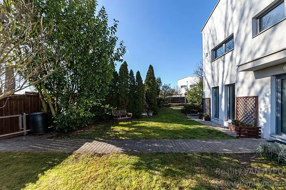 Dvoupodlažní moderně pojatá jednotka s vlastní udržovanou zahradou tvoří polovinu rodinného dvojdomu situovaného v rezidenční části obce Jinočany.