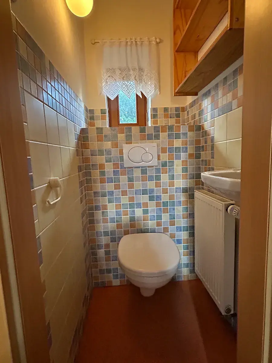 Naproti pokojům se nachází pěkná koupelna (6 m2) se sprchovým koutem, toaletou a pračkou.