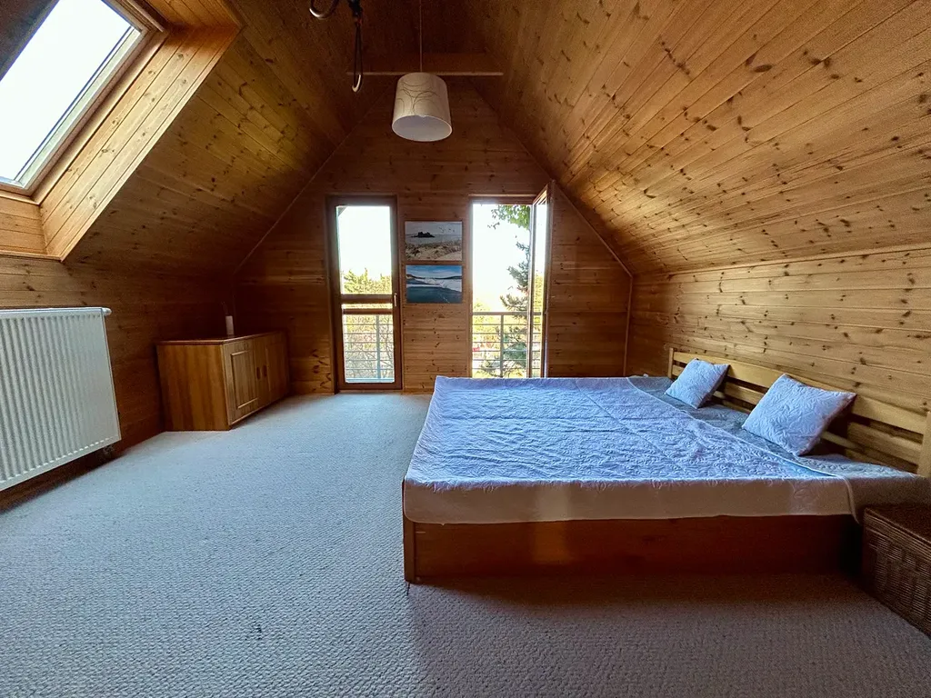 Stylovými schody vstoupíme do patra domu kde se nachází útulná ložnice (23 m2) se vstupem na balkon, ze kterého jsou nádherné výhledy do zahrady. V ložnici vestavěné skříně.