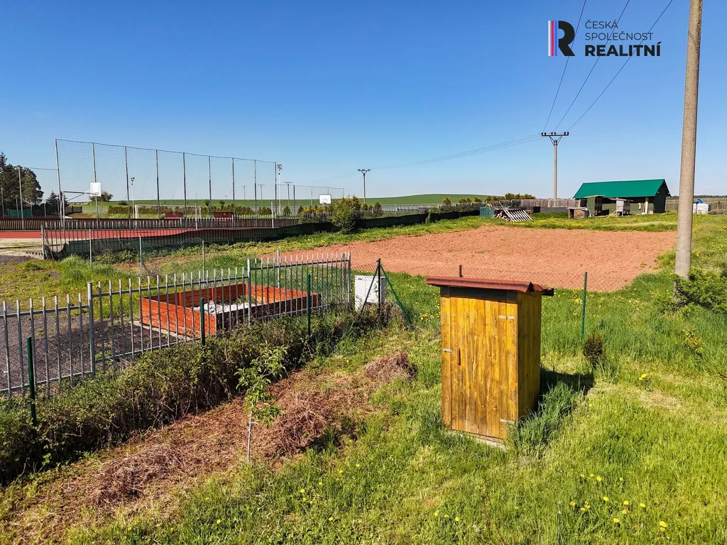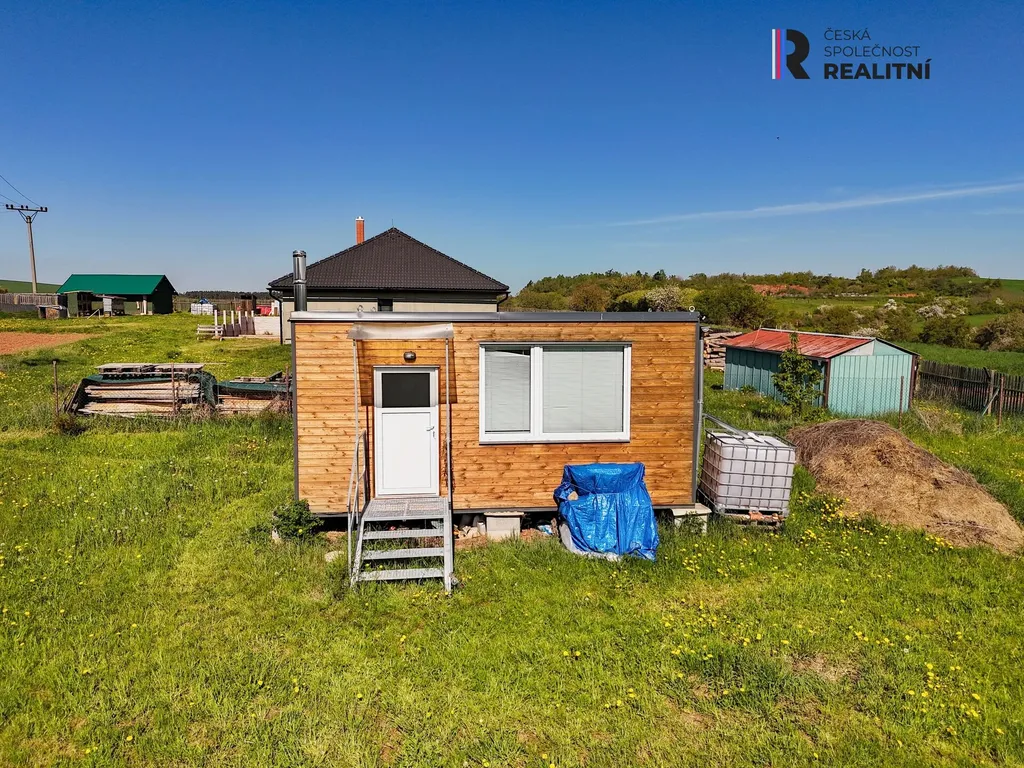 Na pozemku je menší chatka-buňka, která může sloužit jako zázemí během stavby nebo k víkendovému odpočinku.