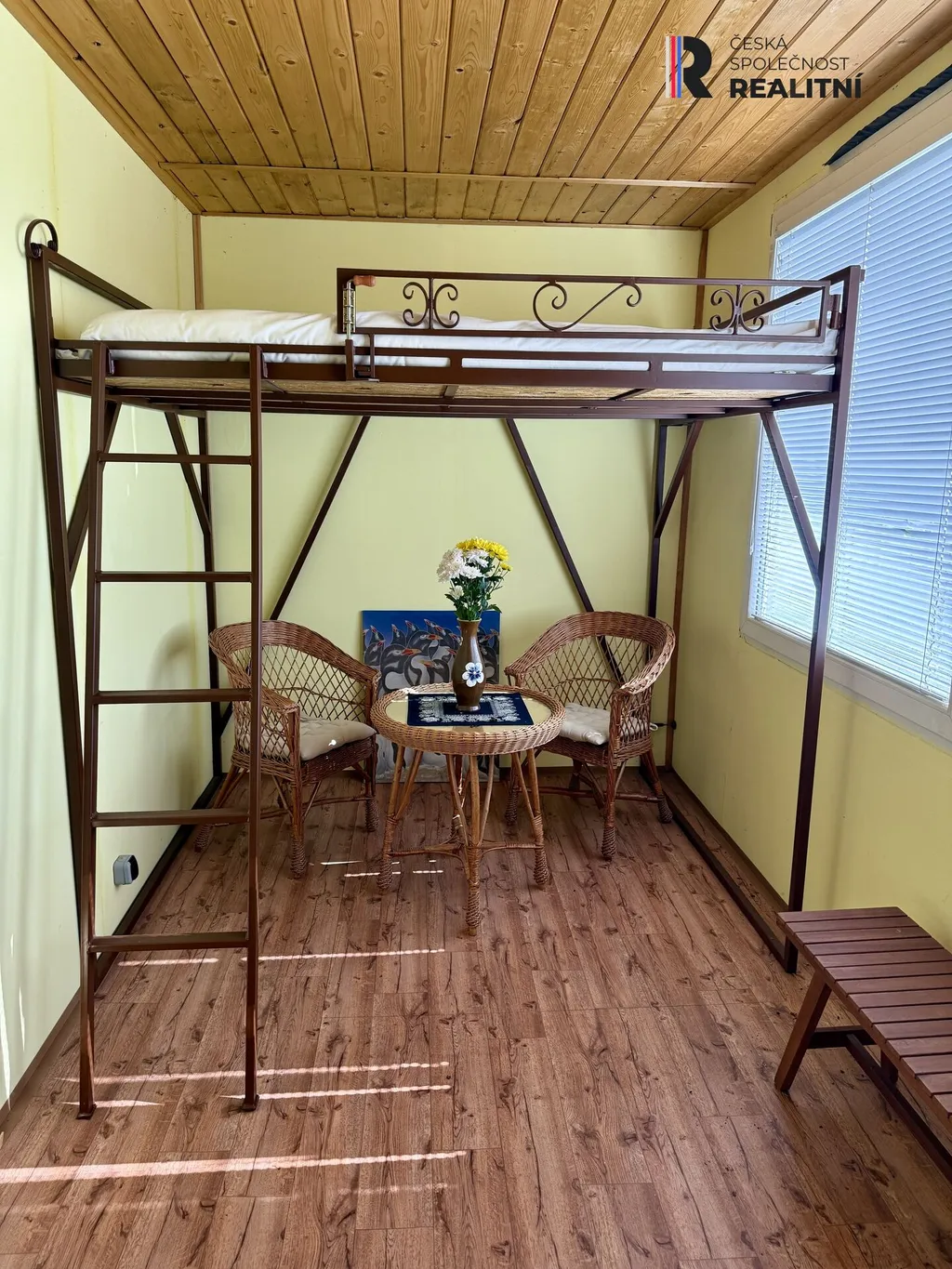 Vnitřní výměra činí 2,15m x 5,6m a jsou zde k dispozici kamna Petry, menší úložné prostory, lavice, patro na spaní a malé ratanové posezení.