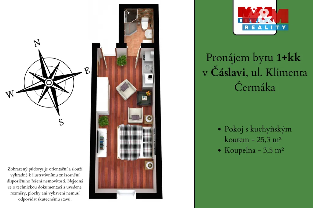 Pronájem bytu 1+kk, 28 m², Čáslav, ul. Klimenta Čermáka