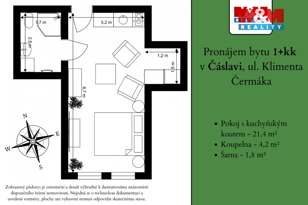 Pronájem bytu 1+kk, 27 m², Čáslav, ul. Klimenta Čermáka