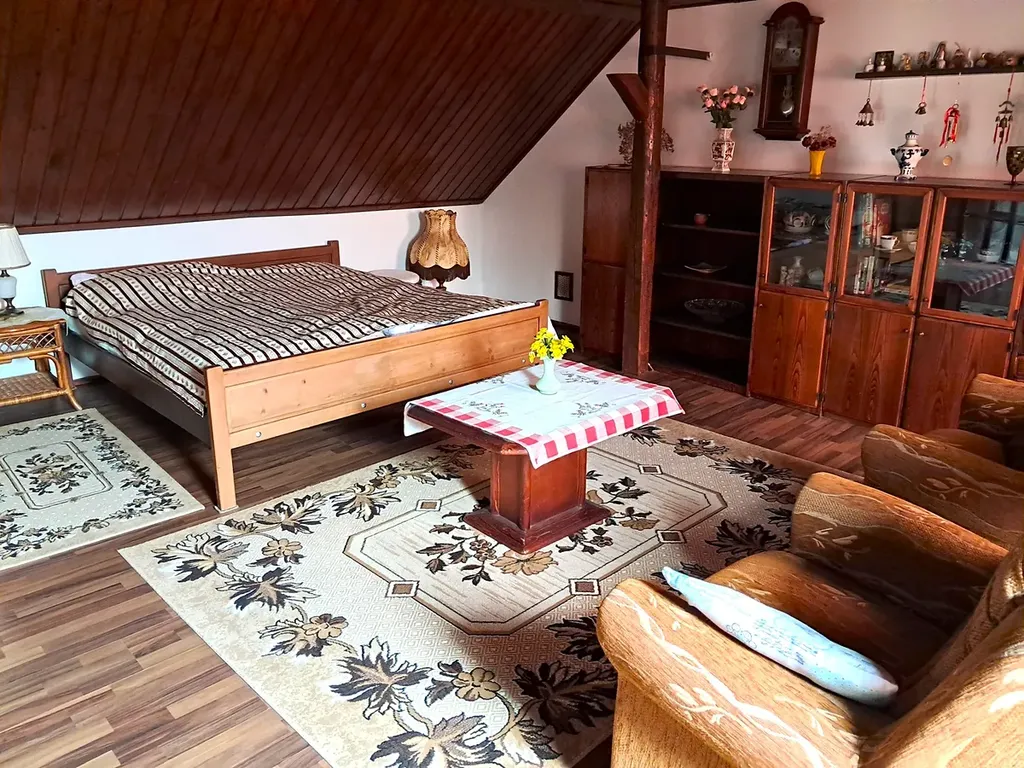 V přízemí obytné části se nachází předsíň, plně vybavená kuchyň s kachlovými kamny, obývací pokoj s krbem, ložnice, koupelna a samostatné WC.