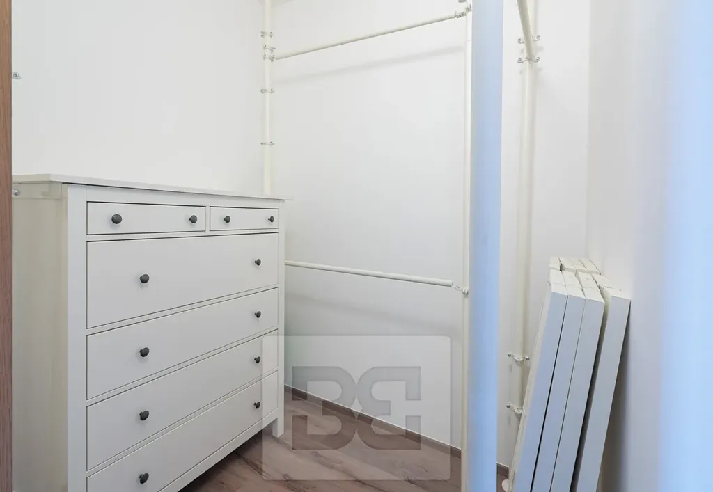 Ložnice je částečně zařízená – postel, pracovní stůl a knihovna. Druhá, menší ložnice je vybavena šatní skříní. Další velkou výhodou je samostatná šatna přímo v bytě.