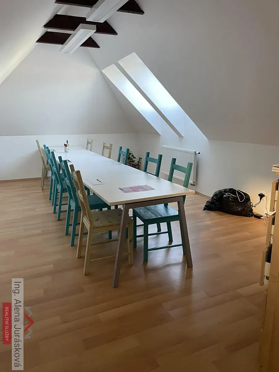 Nabízím k pronájmu místnist v podkroví rodinného domu, buď jako garsonieru nebo kancelář s koupelnou (vana, umyvadlo, WC zvlášť) v podkroví vilky, jejíž přízemí slouží k provozu soukromé mateřské školky (pouze v pracovní dny 8-17). Vstup je ze zadní části budovy společný se školkou, ale se samostatným odděleným schodištěm ze společné chodby. Není zavedena kuchyňka a nabízí se nezařízený nábytkem. Internet si musí řešit nájemce. Zahrada k dispozici pouze o víkendech.