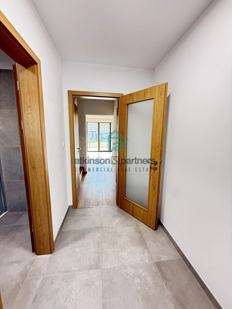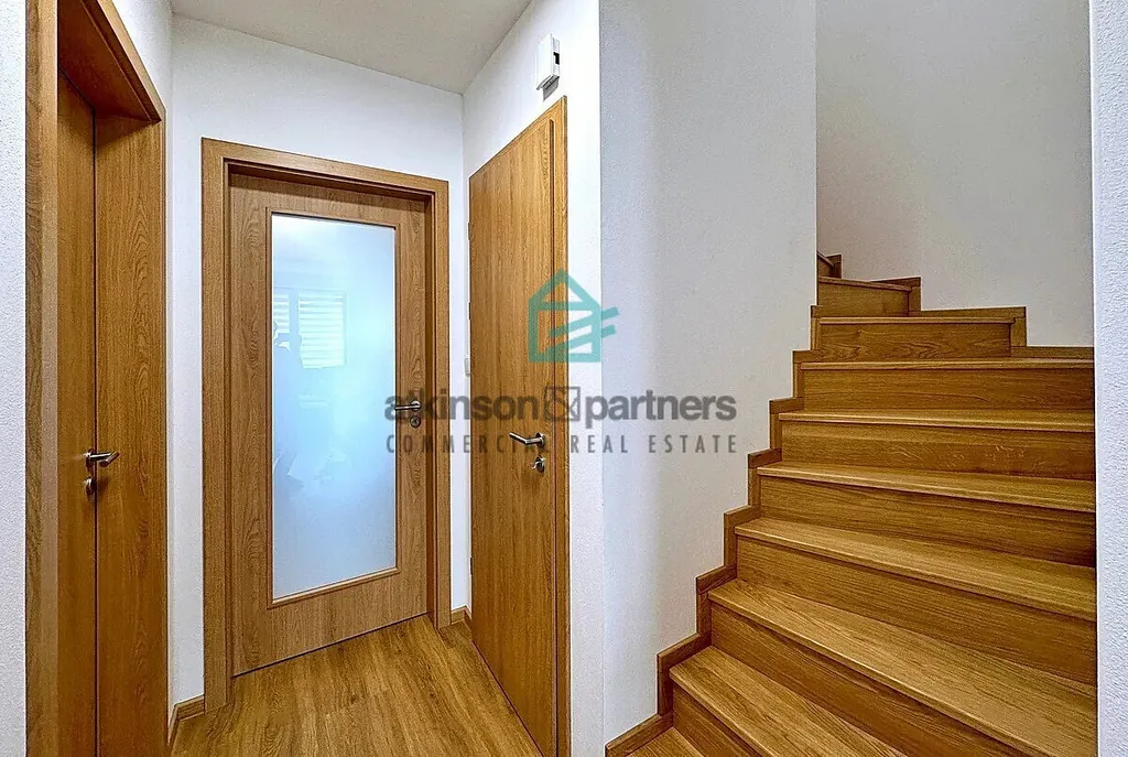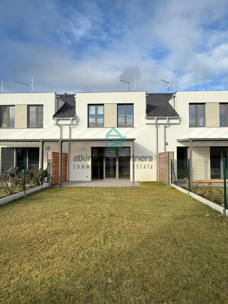 Nabízíme k pronájmu novostavbu rodinného řadového domu o dispozici 5kk, a celkové výměře užitné plochy 139 m², s předzahradou 59 m², a zahradou za domem o výměře 108 m². Přízemí se skládá z předsíně, koupelny s WC a sprchovým koutem, chodby, pracovny, obývacího pokoje s jídelnou a kuchyňským koutem a komory (celková plocha přízemí je 59 m²).