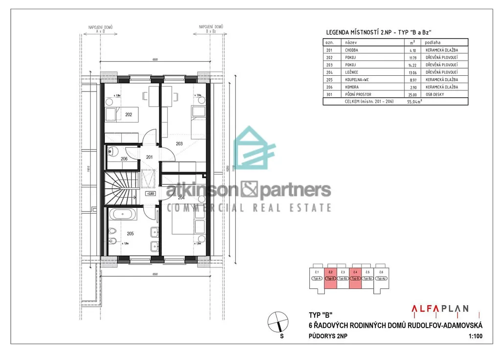 V 1. patře najdete chodbu , 3 ložnice, koupelnu s vanou a WC, a komoru (celková plocha patra je 55 m²).