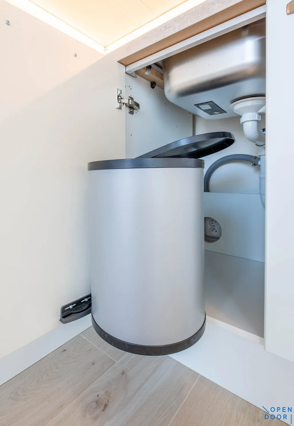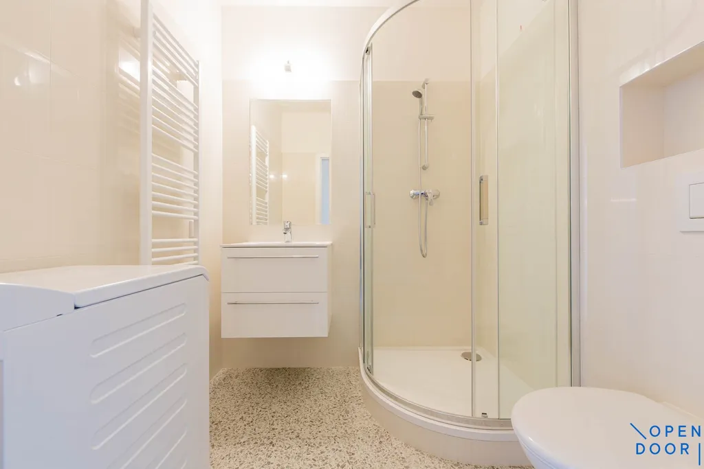 Obě místnosti směřují do ulice. Kuchyň je vybavena kuchyňskou linkou s vestavěnými spotřebiči – lednicí s mrazákem, myčkou nádobí, elektrickým sporákem s varnou deskou a troubou, digestoří. Koupelna je se sprchovým koutem a pračkou, WC je umístěno v koupelně. Předsíň s kuchyní spojují posuvné celoskleněné dveře. V předsíni jsou na míru vyrobené úložné prostory Celý byt je vyladěn do příjemných světlých odstínů, charakteristickým znakem všech místností je ergonomické řešení s dokonalým využitím obytného prostoru a vybavení až do nejmenších detailů (led osvětlení kuchyňské linky, vestavěný koš, v koupelně topný žebřík a zabroušené zrcadlo, stylový bytový zvonek ...).