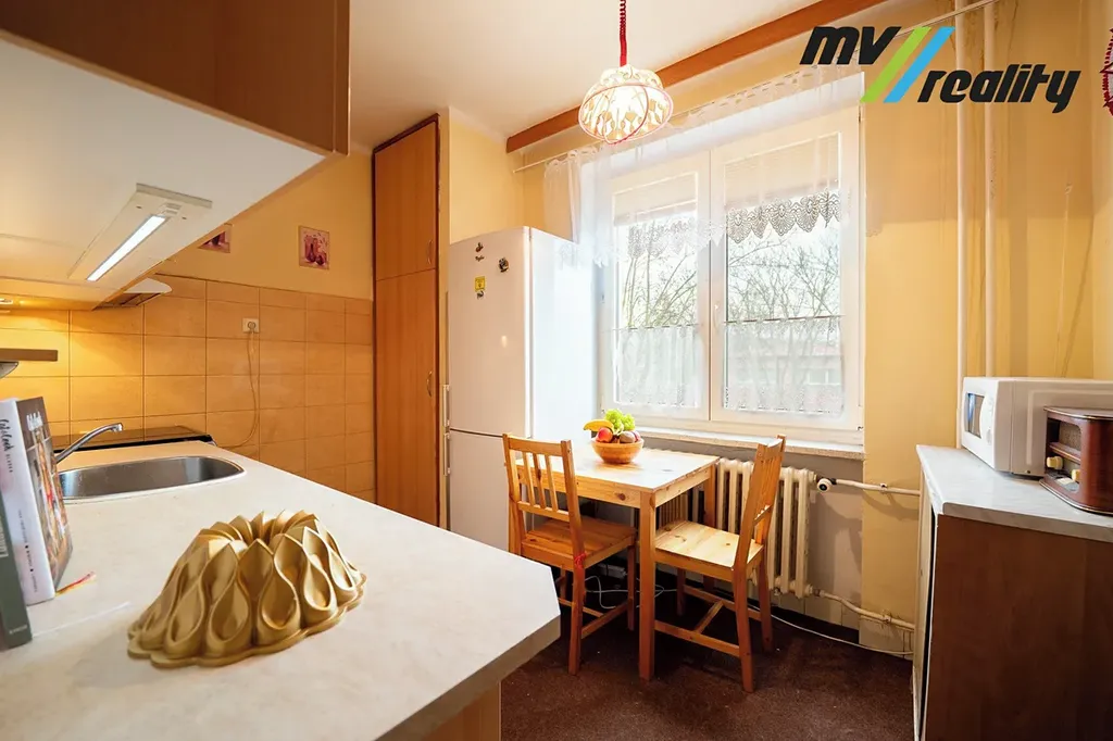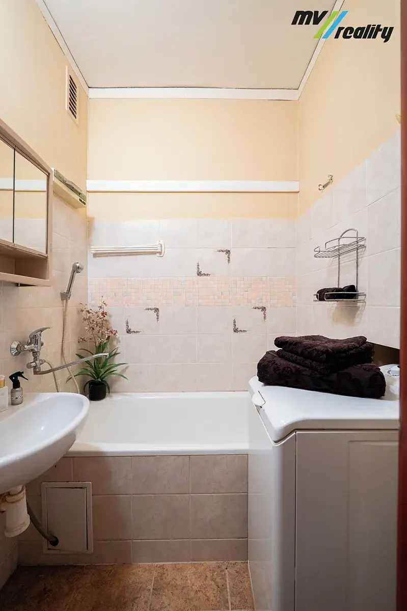Vstupními bezpečnostními dveřmi se dostaneme do předsíně 4,9 m², ze které je vstup do koupelny 2,1 m², oddělené toalety 0,98 m², kuchyně s jídelním koutem 9,4 m² a prostorného obývacího pokoje 20,4 m² s výhledem do parku a balkónem 2 m². Z obývacího pokoje se dostaneme do ložnice 13,63 m². Plastová okna opatřená žaluziemi jsou orientovaná na východ a na západ. Během letošního června je naplánována rekonstrukce balkónů, kde dojde k jejich zvětšení a zasklení. Tím je zřejmé, že místní SVJ skvěle funguje a o dům se stará, což je velice důležité.