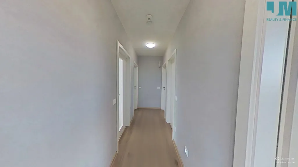 Byt je navržen s důrazem na praktičnost, komfort a moderní styl. Dominantou obytného prostoru je kuchyňská linka do tvaru L v elegantním bílém provedení s tmavou pracovní deskou. Kuchyně je plně vybavena kvalitními spotřebiči – granitovým dřezem, indukční varnou deskou, vestavnou elektrickou troubou, mikrovlnnou troubou, digestoří, myčkou nádobí a vestavnou lednicí.