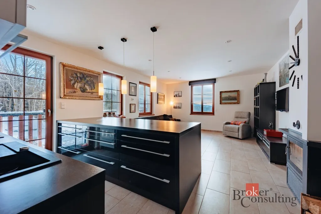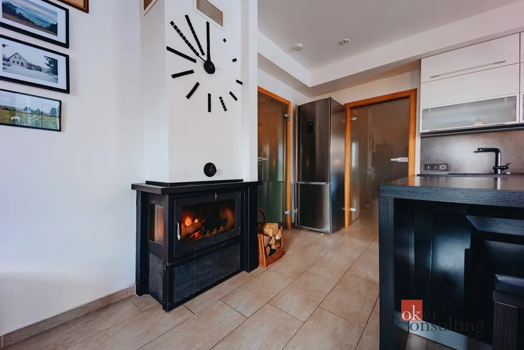 Přímo v Krkonošském národním parku, v horské vesnici Strážné v nadmořské výšce 800 m.n.m. se nachází moderní apartmán, který v sobě stále ukrývá ducha hor. Dispozice 2 + kk a 54 metrů podlahové plochy nabízí dostatečný prostor jak pro klidný rodinný pobyt tak i pro menší oslavy s přáteli. Úsporu prostoru zajišťují vestavěné skříně v chodbě a v ložnici. Kuchyně je plně vybavena vestavěnými spotřebiči a disponuje moderním barovým ostrůvkem s možností posezení. Podlahové vytápění je v celém apartmánu. Pohodovou atmosféru dokreslí krb s rozvodem tepla do ložnice. Koupelna se sprchovým koutem, 2 umyvadly, pračkou a susičkou je oddělena od samostatně stojícího WC. Kdo nemá po celodenní tůře či lyžování horského vzduchu dost, může si ho vychutnávat na vlastní terase plnými doušky. K dispozici také krytý bazén a sauna v suterénu. Vyhrazené parkovací stání u domu. 2 lyžařské vleky se zasněžováním, večerním lyžováním, restaurace, kavárna, lyžařská škola, či strojově upravované běžecké stopy v docházkové vzdálenosti od domu. Připraveno k okamžitému nastěhování, bez nutnosti dalších investic do vybavení.