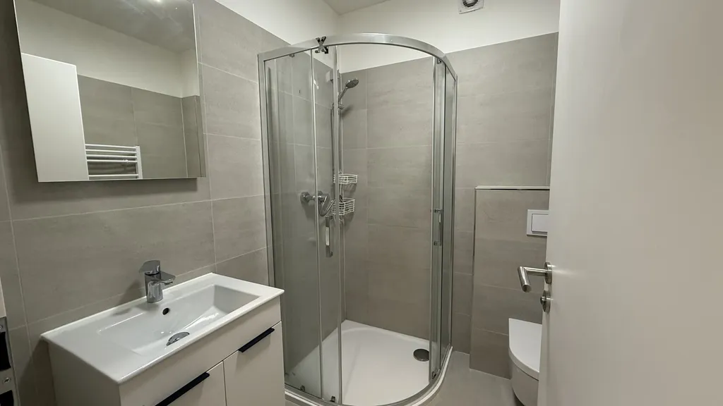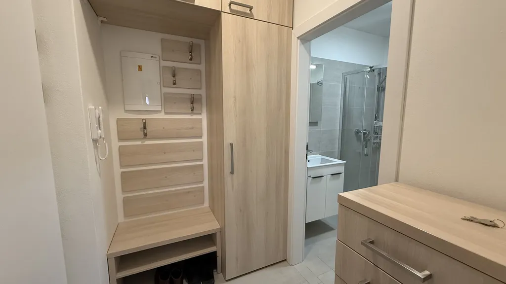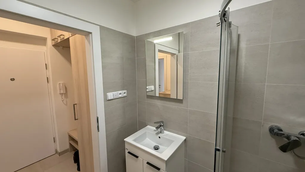 Na vstupní chodbě jsou úložné prostory pro kabáty, obuv i místo na přezutí. Koupelna má velmi prostorný sprchový kout, umyvadlo se zrcadlem, skříňkou, WC a k dispozici je i automatická pračka.