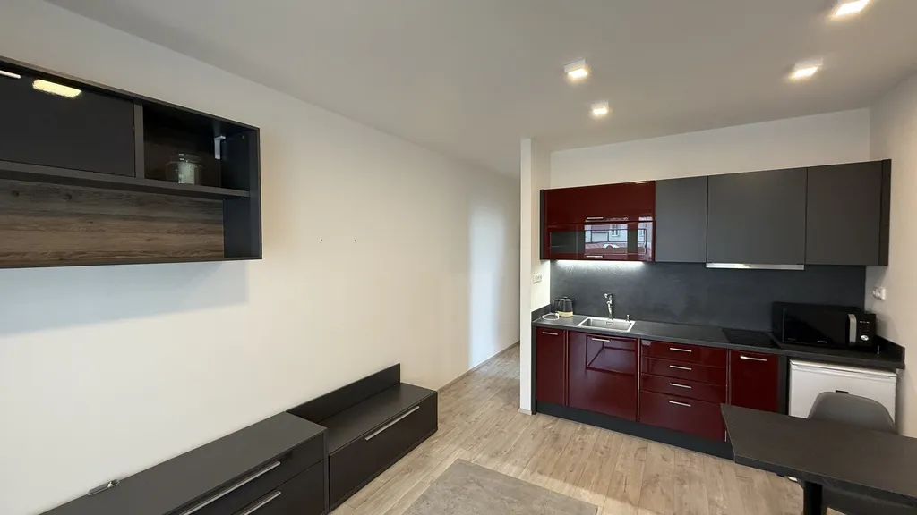 V prostorném obývacím pokoji s kuchyní, který je velmi hezky prosvětlen balkónovými dveřmi, je k dispozici moderní rozkládací pohovka, konferenční stůl, jídelní stůl se židlemi a TV sestava se skříňkami. V kuchyni na míru je vše potřebné, varná deska s digestoří, mikrovlnná trouba i lednice, vše integrováno do linky a v neposlední řadě i rychlovarná konvice.