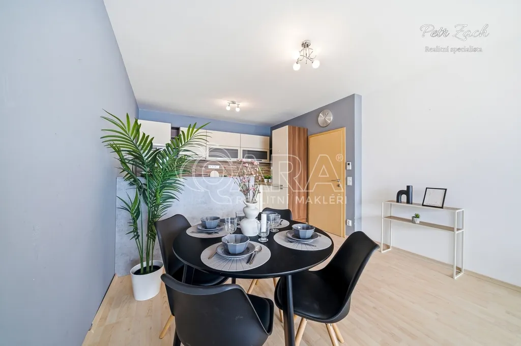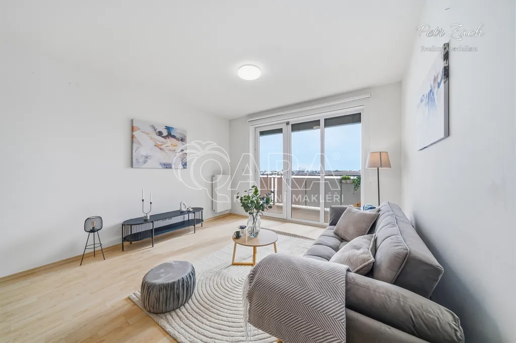 Dominantou bytu je velkorysý obývací pokoj s kuchyňským koutem a plně vybavenou kuchyňskou linkou. Díky orientaci na jih a východ je interiér po celý den zalitý přirozeným světlem, což vytváří příjemnou a pozitivní atmosféru.