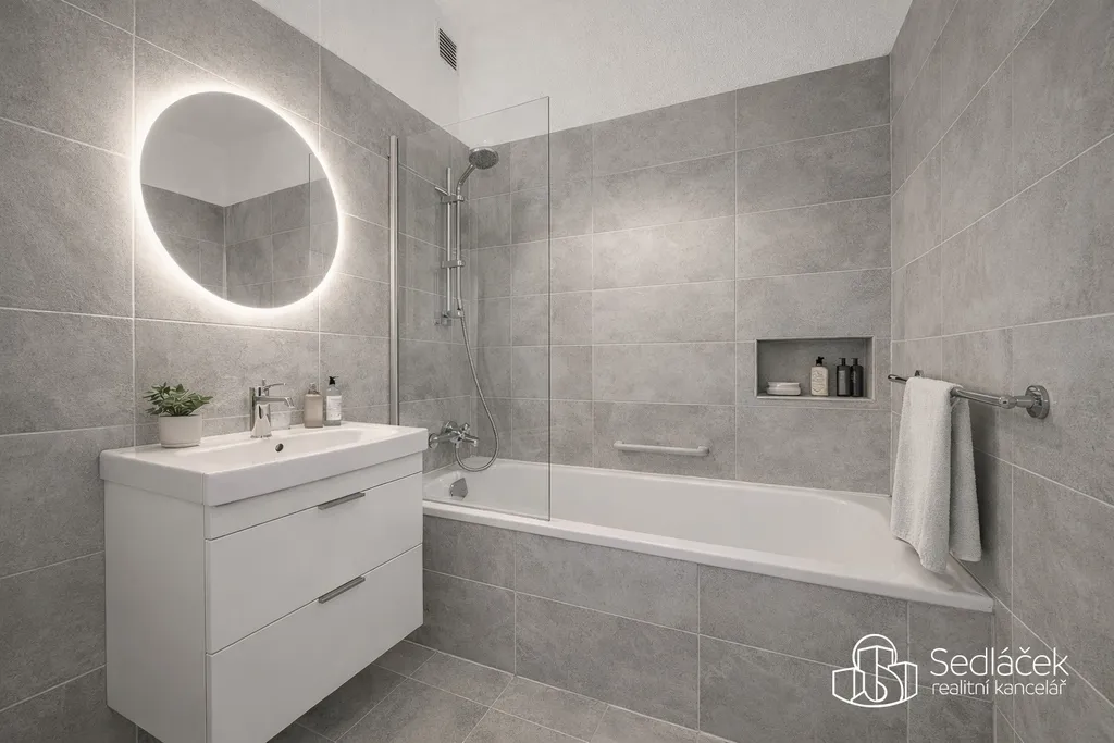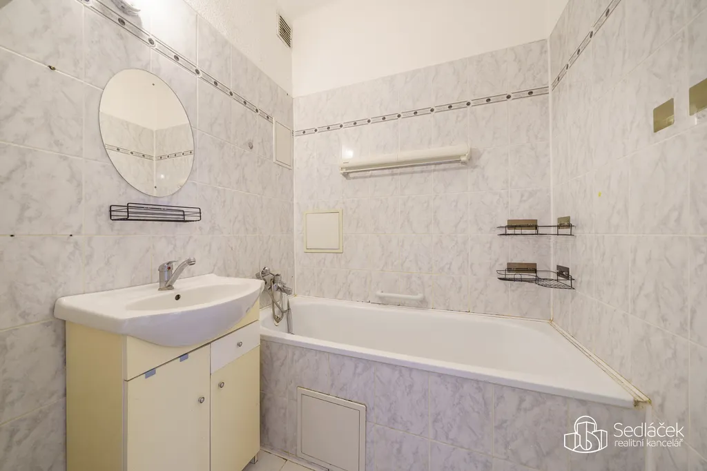 Byt disponuje koupelnou s vanou, toaleta je samostatná. Vstupní chodba nabízí dostatek místa pro vestavěné skříně či jiné úložné řešení.