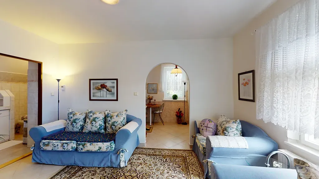 ve 2. NP je prostorný obývací pokoj s kuchyňským koutem, dva pokoje, koupelna se sprchou, WC a chodba. Většina obytných částí má jižní orientaci s odpoledním slunkem.