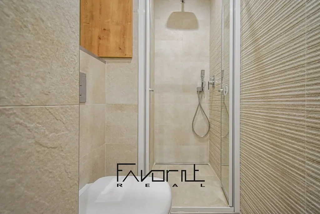 Nově vyzděná koupelna má nádherné kvalitní světlé obklady i dlažbu, kvalitní umyvadlo se skříňkou, nádherné kvalitní baterie, sprcha je dlážděná s odtokovým žlabem, WC sedátko s pomalým sklápěním, zrcadlo s led osvětlením.