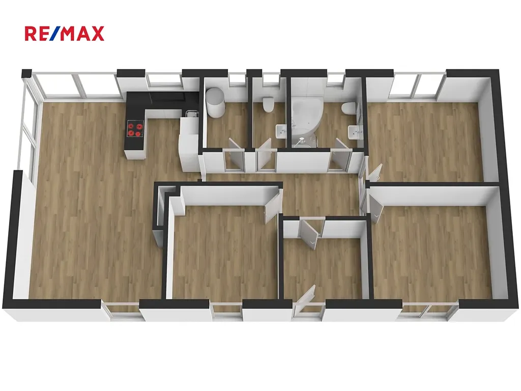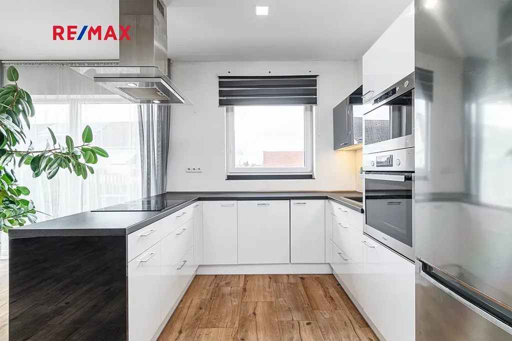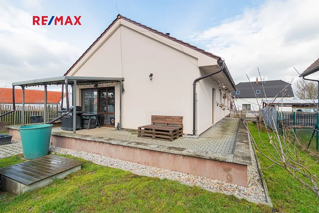 Dispozičně je rozdělena na velkorysý obývací prostor s kuchyňským koutem a se vstupem na zahradu, dále na tři ložnice, koupelnu s WC, samostatné WC, technickou místnost, chodbu a prostornou předsíň.