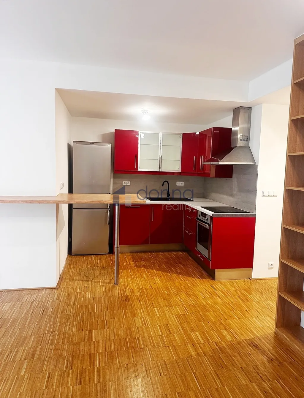 Je bez nábytku, k dispozici kuchyň s novými spotřebiči (pult, varná deska, trouba, lednice, myčka, digestoř) a vestavěné skříně.