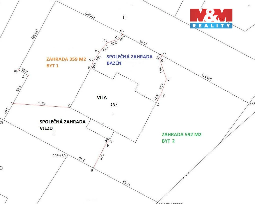 Byt je o dispozici 1+kk (28,7 m²) s komorou/sklepem (5,5 m²) a podílem na společných částech zahrady se sdílenou terasou a bazénem. Zahrada je osazena vzrostlou zelení a garantuje tak soukromí.