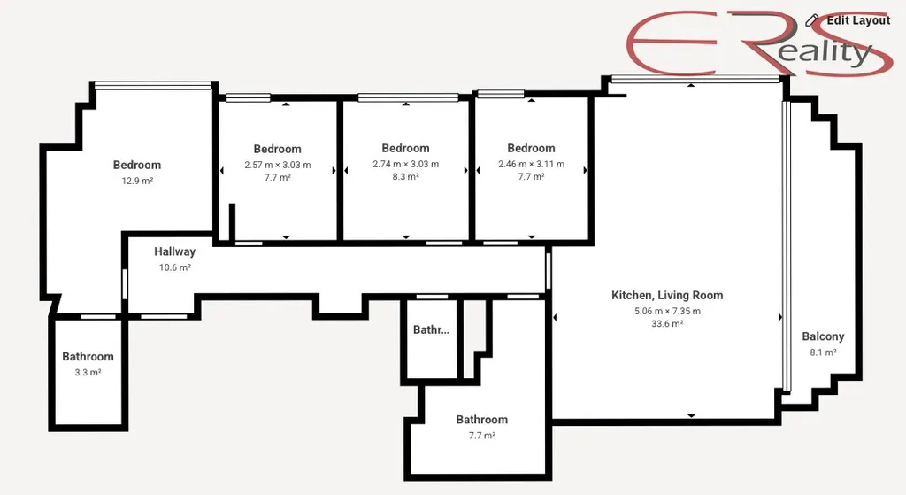 Byt má 4 ložnice a obývák s kuchyňským koutem, takže: