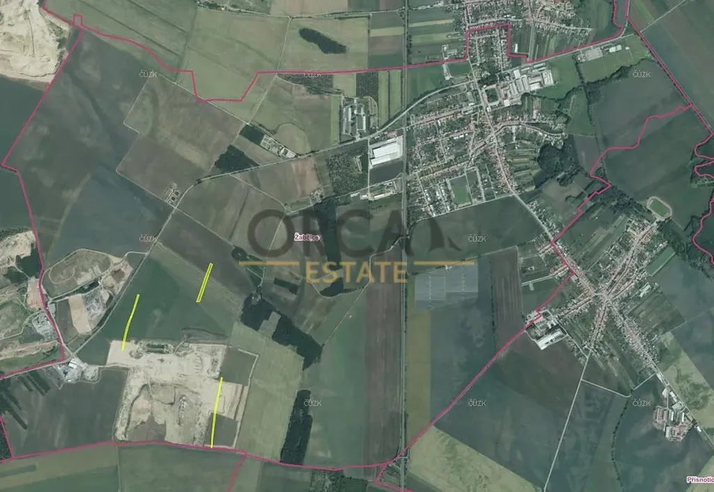 Nabízíme k prodeji pozemky ve výlučném vlastnictví v k.ú. Žabčice, okres Brno-venkov. Jedná se o pět parcel č. 1308/72 o šířce cca 15 m a parcely 1308/106, 1309/8, 1310/75 a 1312/9 měří na šířku cca 8 m. Celková výměra prodávaných pozemků činí 10.011 m2. Pozemky jsou evidovány jako orná půda a ostatní plocha. Dle územního plánu se parcely 1308/106, 1309/8 a 1312/9 nachází v plochách těžby nerostů a v návrhu ploch pro drážní dopravu, parcela 1310/75 leží v ploše těžby nerostů a parcela č. 1308/72 leží v plochách zemědělských. Pozemky se nachází na jihovýchodě obce. V současné době jsou pozemky propachtovány, a to na dobu neurčitou s výpovědní lhůtou 1 rok.
