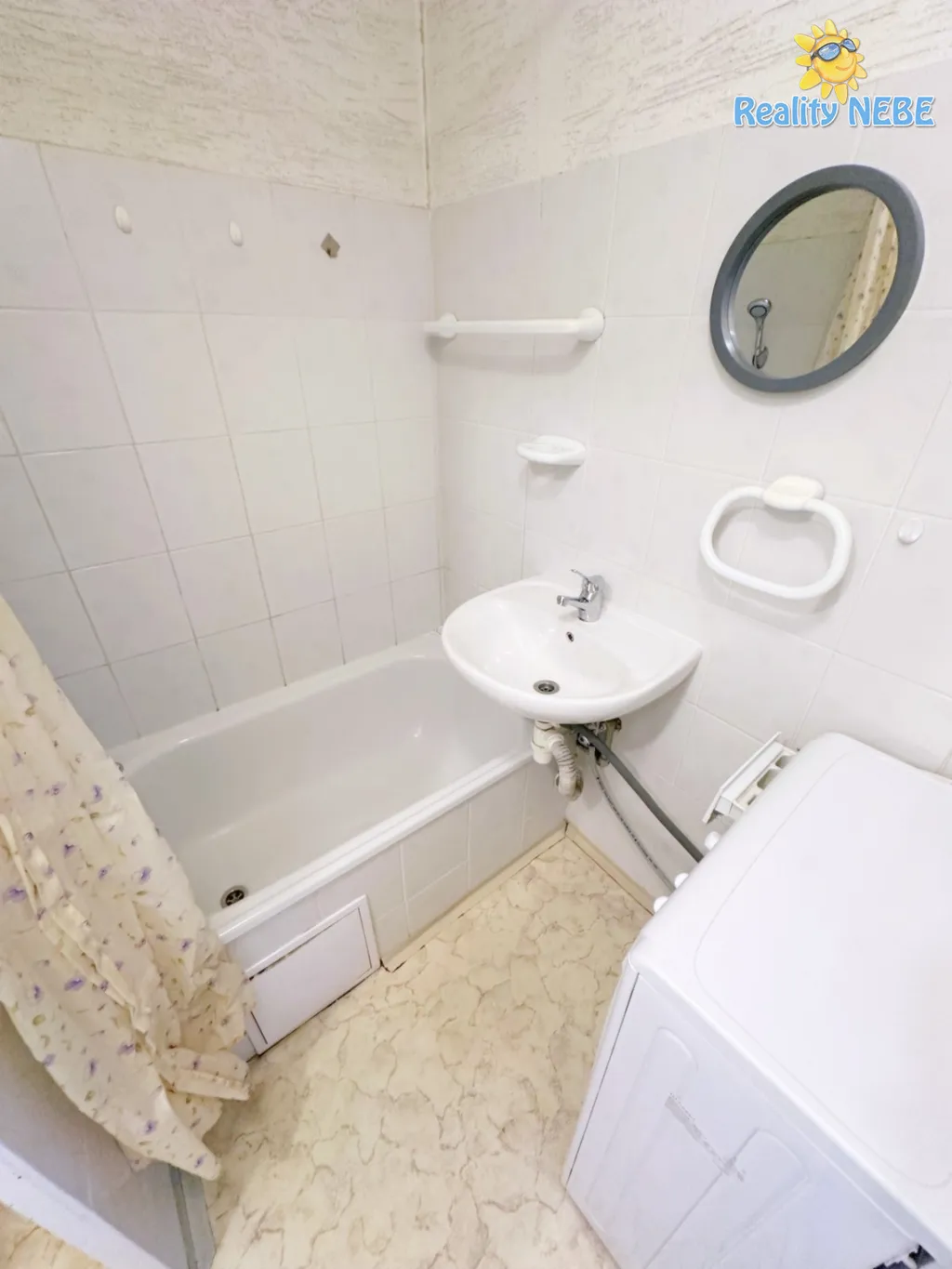 Koupelna s vanou, WC a pračkou. Díky dálkovému topení a jižní orientaci je byt teplý.