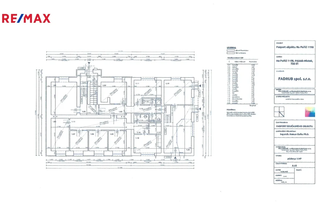 Nabízíme k pronájmu komerční objekt - administrativní budovu s kancelářemi ve strategické lokalitě na adrese Na Poříčí č.p. 1198 ve Frýdku-Místku. Jedná se o zděnou patrovou budovu s dřevěnými prvky (vstupní zádveří) a dřevěnou konstrukcí krovu, vnitřní příčky a podhledy jsou tvořeny SDK deskami na nosné konstrukci. Objekt je částečně podsklepený. V 1. nadzemním podlaží jsou kancelářské prostory, hygienické zázemí (koupelny a WC), serverovna, denní místnost, recepce a prostor pro expedici. Ve 2. NP se nacházejí další kanceláře. Podkroví je momentálně nevyužité, rozdělené do několika menších místností. 1. podzemní podlaží slouží převážně jako skladovací prostor. Dům je v dobrém stavebně‑technickém stavu.