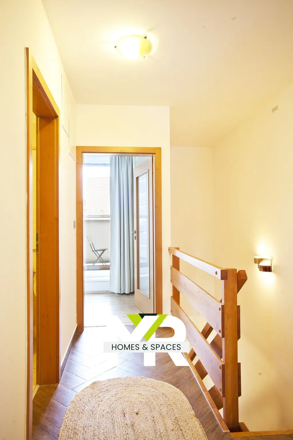V patře se nacházejí tři ložnice. Z každé je přístup na terasu. Dvě terasy o výměře 4,15 m² a 7,75 m² rozšiřují obytný prostor směrem ven a dávají domu větší rozměr, než by napovídala samotná podlahová plocha. Jedna ložnice disponuje vlastní koupelnou se sprchovým koutem, druhá koupelna s vanou je přístupná z chodby.