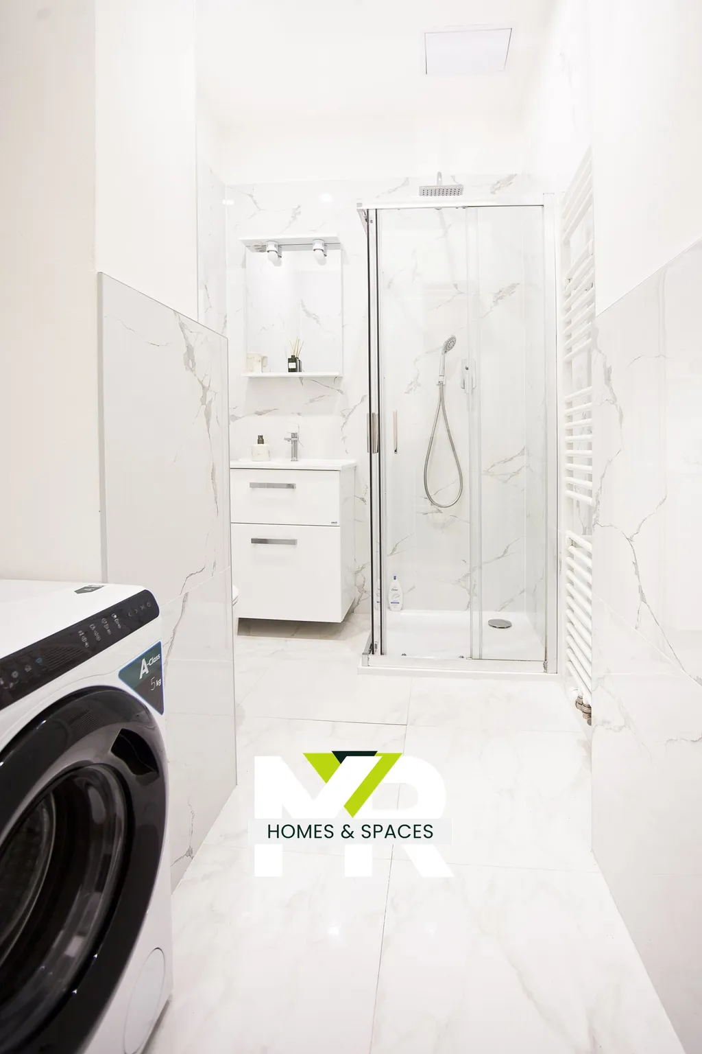 * koupelnu v mramorovém stylu se sprchovým koutem a pračkou