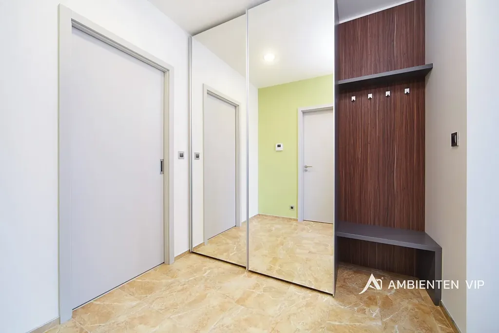 Byt je nabízen kompletně zařízený nábytkem a pračkou. Nemovitost disponuje moderní kuchyňskou linkou se spotřebiči (varná deska, trouba, digestoř, mikrovlnná trouba, lednice, myčka), obývací prostor je vybaven jídelním stolem s židlemi, konferenčním stolkem, televizní stěnou s TV a sedací soupravou. V bytě je dostatek úložného prostoru ve formě šatních skříň, ložnice disponuje manželskou postelí s matracemi.