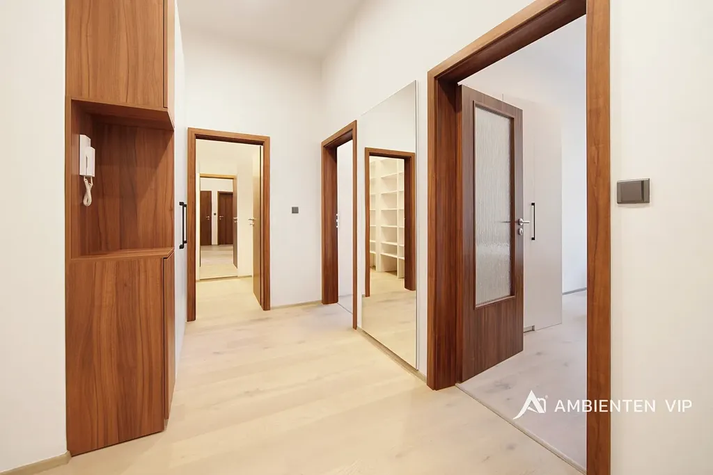 Obě ložnice jsou zařízené dvoulůžkovými postelemi, vestavěnými skříněmi a stoly s židlemi. K dispozici je dále prostorná šatna. Koupelna disponuje sprchovým koutem, umyvadlem se skříňkou, zrcadlem, pračkou a sušičkou. Toaleta je odděleně. Předsíň je vybavena vestavěnou skříní. Internet je již zahrnut v ceně.