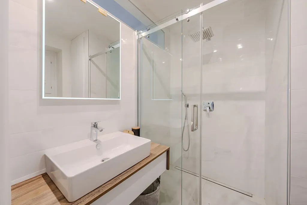 Koupelna se sprchovým koutem a WC.