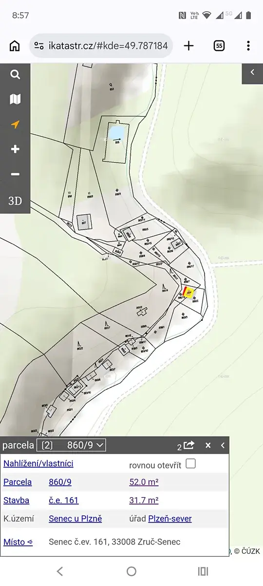 V exkluzivním zastoupení majitelem si Vám dovolujeme nabídnout pozemek v malebném údolí kousek od řeky Berounky.Hledáte klidné bydlení v lese a zároveň blízko Plzně,máme.Nabízíme pozemky které na sebe navazují a dohromady dávají výměru 853m2.Na jednom z pozemků se nachází dřevěná chatka se zastavěnou plochou 52m2 ( 860/4 LV 1301) kat.území Senec u Plzně. Je zde připojena elektrická energie, voda čerpána ze studny. Topení formou kamen na tuhá paliva. Chatka jako taková se skládá ze dvou pokojů a jedné kuchyňky. Je podsklepená. Pozemek 853m2 lze dle územního plánu případně využít i pro výstavbu kde zastavěná pevná podlahová část může být 10% z velikosti pozemku, je možno jít do patra -podkroví ,či stavbu rozšířit o tzv.piloty které nejsou považovány za pevnou podlahovou zastavěnou plochu a stavbu tím rozšiříte nad rámec 10% zastavěné části z pozemku.V případě zájmu nás kontaktujte