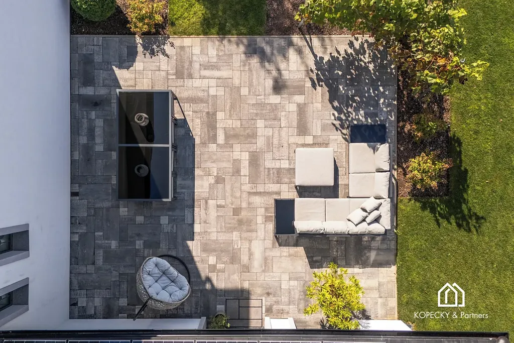 Na profesionálně udržované zahradě najdete zastřešený bazén 8×4 m se slanou vodou, zavlažovací systém, vrtanou studnu a zahradní domek. Parkování je zajištěno v dvojgaráži a na dalších plochách až pro 7 automobilů, včetně přípravy na dobíjení elektromobilů.