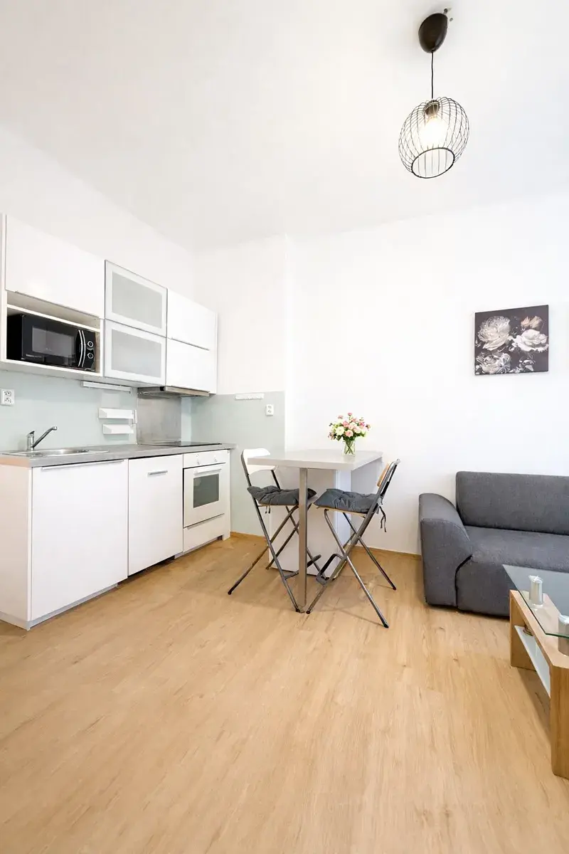 Byt je plně zařízený a připraven k okamžitému nastěhování. Kuchyňská linka je vybavena všemi spotřebiči, včetně myčky nádobí, lednice, sporáku, digestoře a rychlovarné konvice, k dispozici je rovněž pračka. V bytě proběhla citlivá částečná rekonstrukce – nové podlahy, čerstvá výmalba, profesionální tepování a důkladný úklid zajišťují vysoký komfort bydlení bez nutnosti dalších investic.