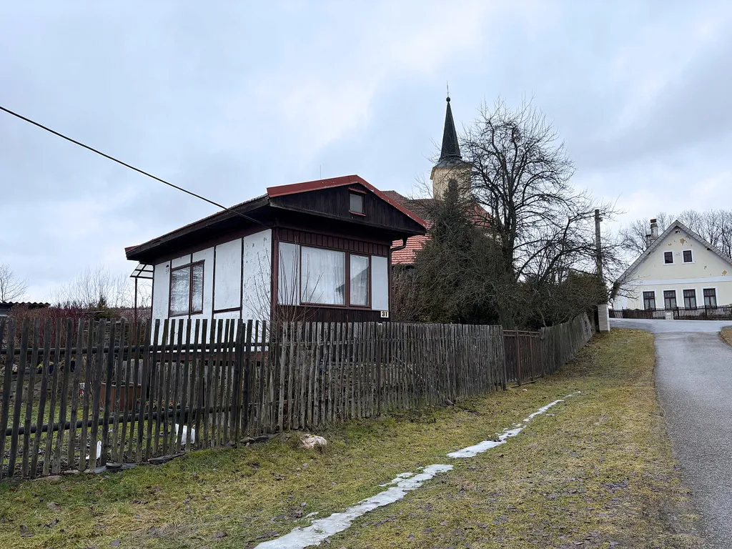 Na pozemku stojí původní montovaná chata (č. ev. 31), vhodná k demolici.